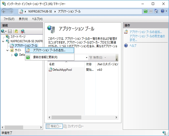 画面ツリーの[アプリケーション プール]を右クリックして、ポップアップメニューから[アプリケーション プールの追加]を選択します。